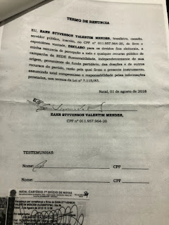 O Capitão da Polícia Militar Styvenson Valentim assinou um “Termo de Renuncia” onde declara que não tem interesse de receber nenhuma verba partidária vindo do partido Rede Sustentabilidade. No termo assinado, ele fala que independentemente da origem do dinheiro, seja do fundo partidário, das doações ou de outros recursos do partido.