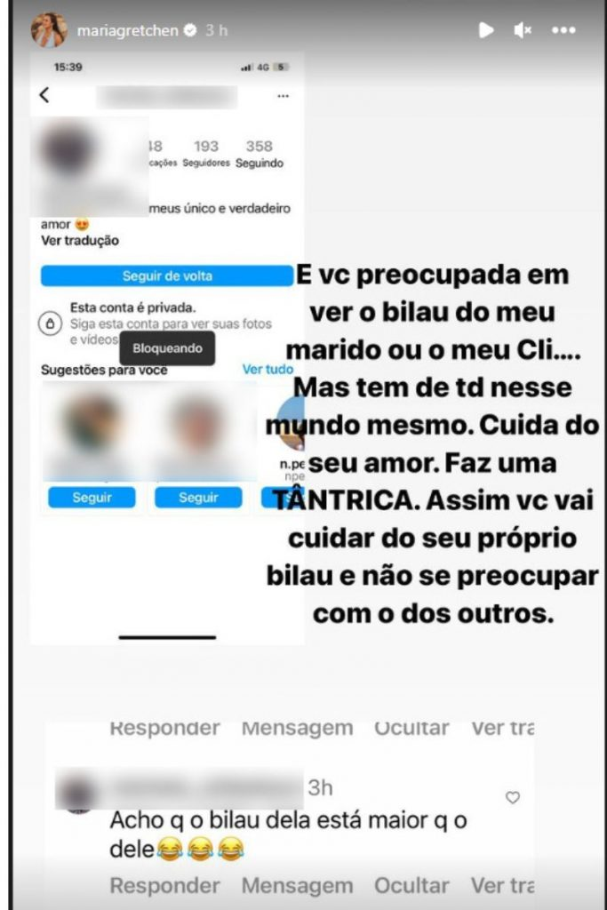 Gretchen respondeu: “E você preocupada em ver o b**au do meu marido ou o meu clit**is… Mas tem de tudo nesse mundo mesmo! Cuida do seu, amor! Faz uma tântrica, assim você vai cuidar do seu próprio b*lau e não se preocupa com o dos outros.”