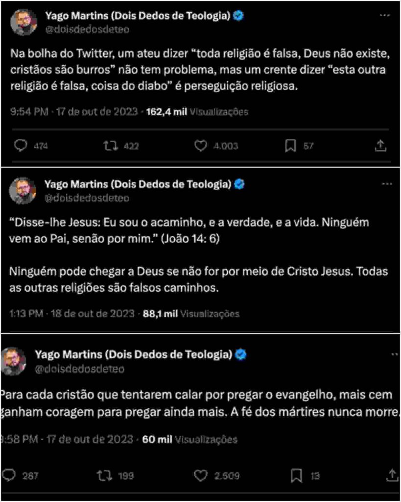 “Na bolha do Twitter, um ateu dizer ‘toda religião é falsa, Deus não existe, cristãos são burros’ não tem problema, mas um crente dizer ‘esta outra religião é falsa, coisa do diabo’ é perseguição religiosa. No dia que o pessoal do Twitter descobrir que o apóstolo Paulo diz que todo que não é verdadeiramente cristão é um servo do diabo, vão tratar toda exposição bíblica em Efésios 2 como crime”, acrescentou.