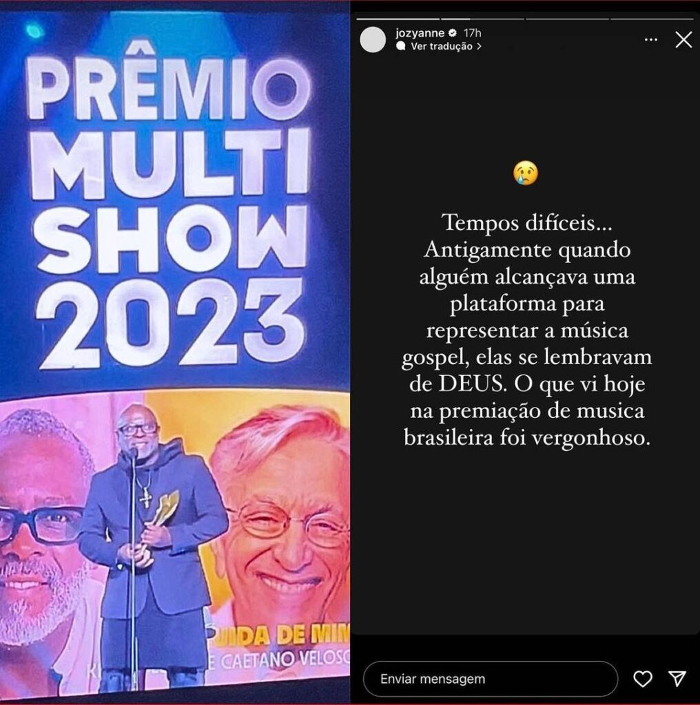 O discurso de Kleber Lucas no Prêmio Multishow vem dando o que falar nas redes sociais. Desta vez, a cantora gospel Jozyanne comentou sobre a premiação de música da TV Globo nos stories do Instagram.