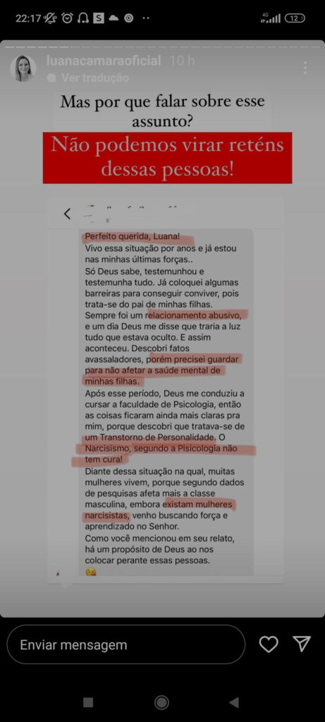 “Em pensar que um dia eu ouvi… ‘Você não tem vontade de colocar a cabeça dele na privada?’ Foi uma tentativa de desqualificar meu marido (Ela ama fazer isso com as pessoas, ‘brincando’).” Escreveu a pastora.