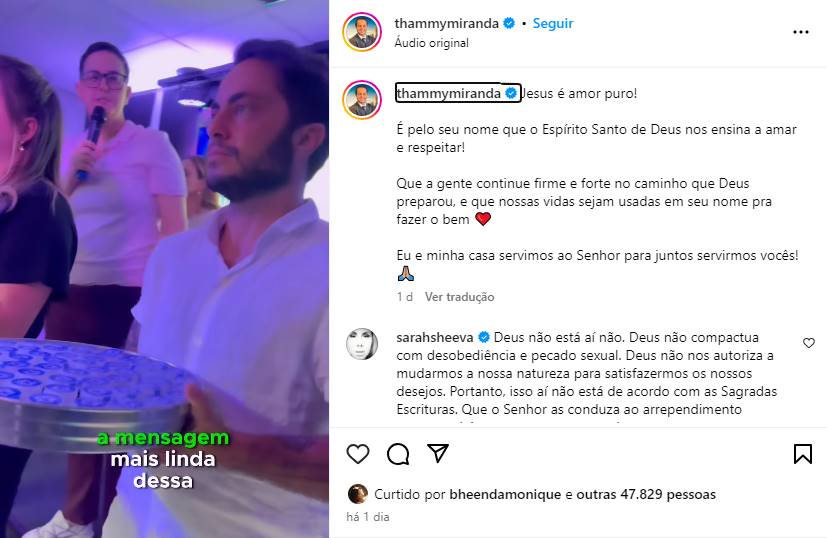 A pastora Sarah Sheeva, fundadora do ministério Culto das Princesas, respondeu à publicação de Thammy, enfatizando a importância da obediência às Escrituras e advertindo sobre o pecado.