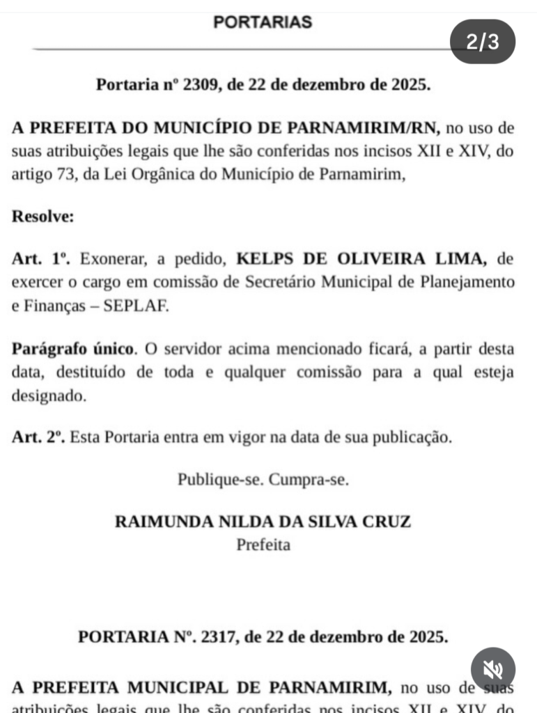 Após quase um ano à frente da Secretaria Municipal de Planejamento e Finanças (SEPLAF), Kelps Lima foi exonerado a pedido do cargo, conforme portaria publicada nesta terça-feira (22) pela Prefeitura de Parnamirim. A decisão ocorre em meio ao reposicionamento político de Kelps, que é pré-candidato a deputado federal. Nos bastidores, a avaliação é de que a saída da secretaria permitirá maior dedicação à construção do seu nome em todo o estado do Rio Grande do Norte, em uma pré-campanha mais intensa e articulada.